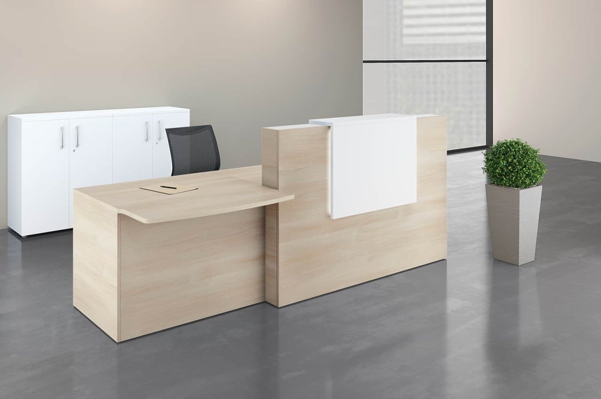 Les finitions en bois résistantes nécessitent peu d’entretien et s’intègrent parfaitement dans tous types d’environnements tertiaires. Enfin, pour le bien-être de vos hôtes et hôtesses, n’oubliez pas d’ajouter un fauteuil de bureau ergonomique adapté à la hauteur du module bureau.