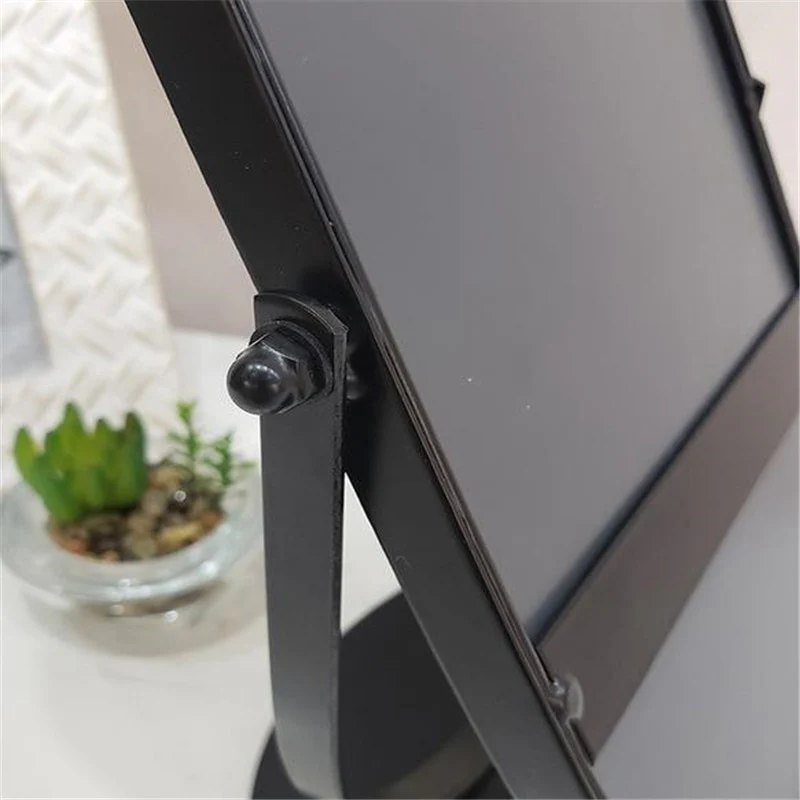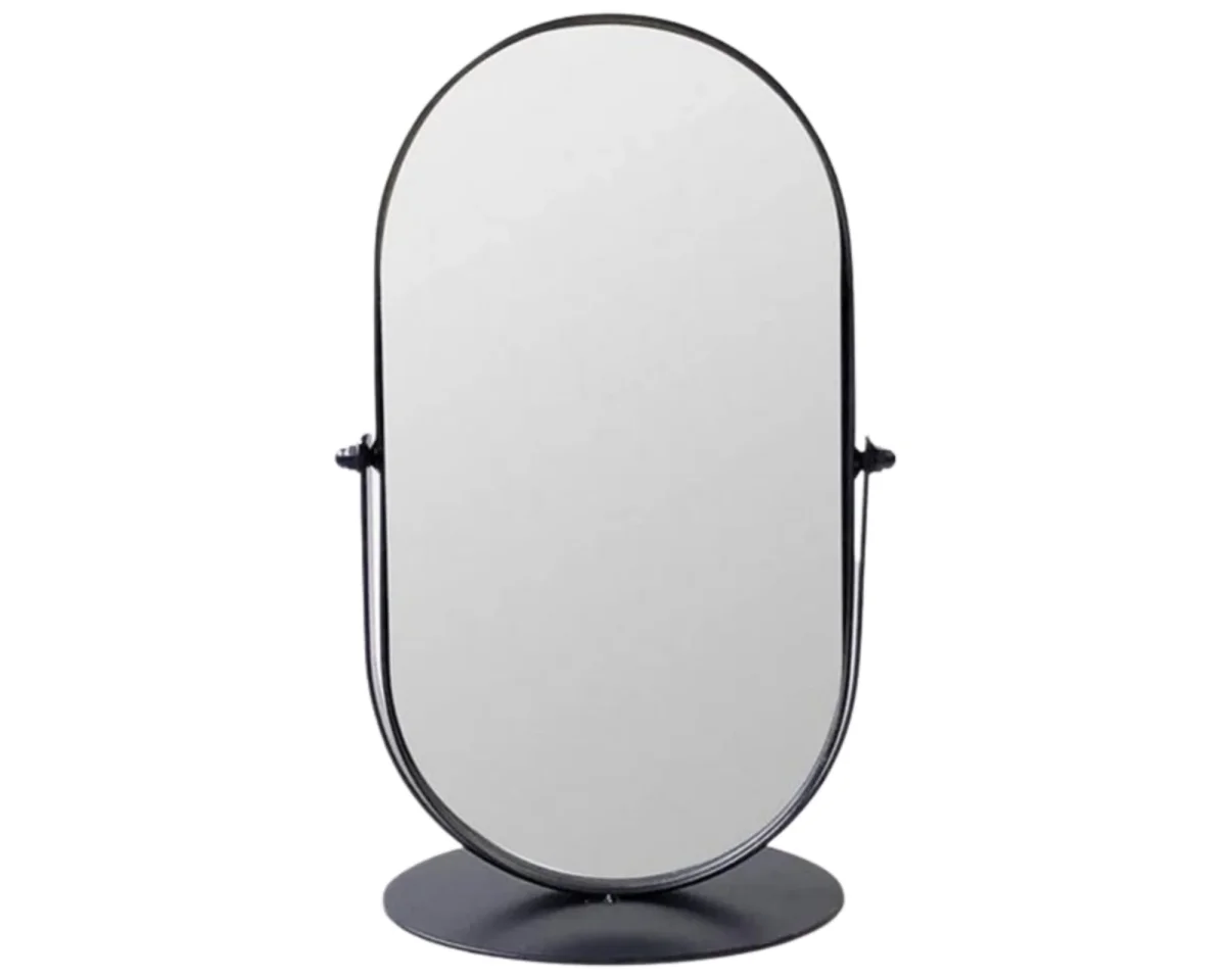 DÉCOUVREZ CE MIROIR MAQUILLAGE NOIR EN FORME OVALE ARRONDIE SUR UN PIED ROND. LE MIROIR EST MONTÉ SUR ARC DE CERCLE EN MÉTAL POUR LUI DONNER DE LA ROBUSTESSE AINSI QU’UNE ROTATION.