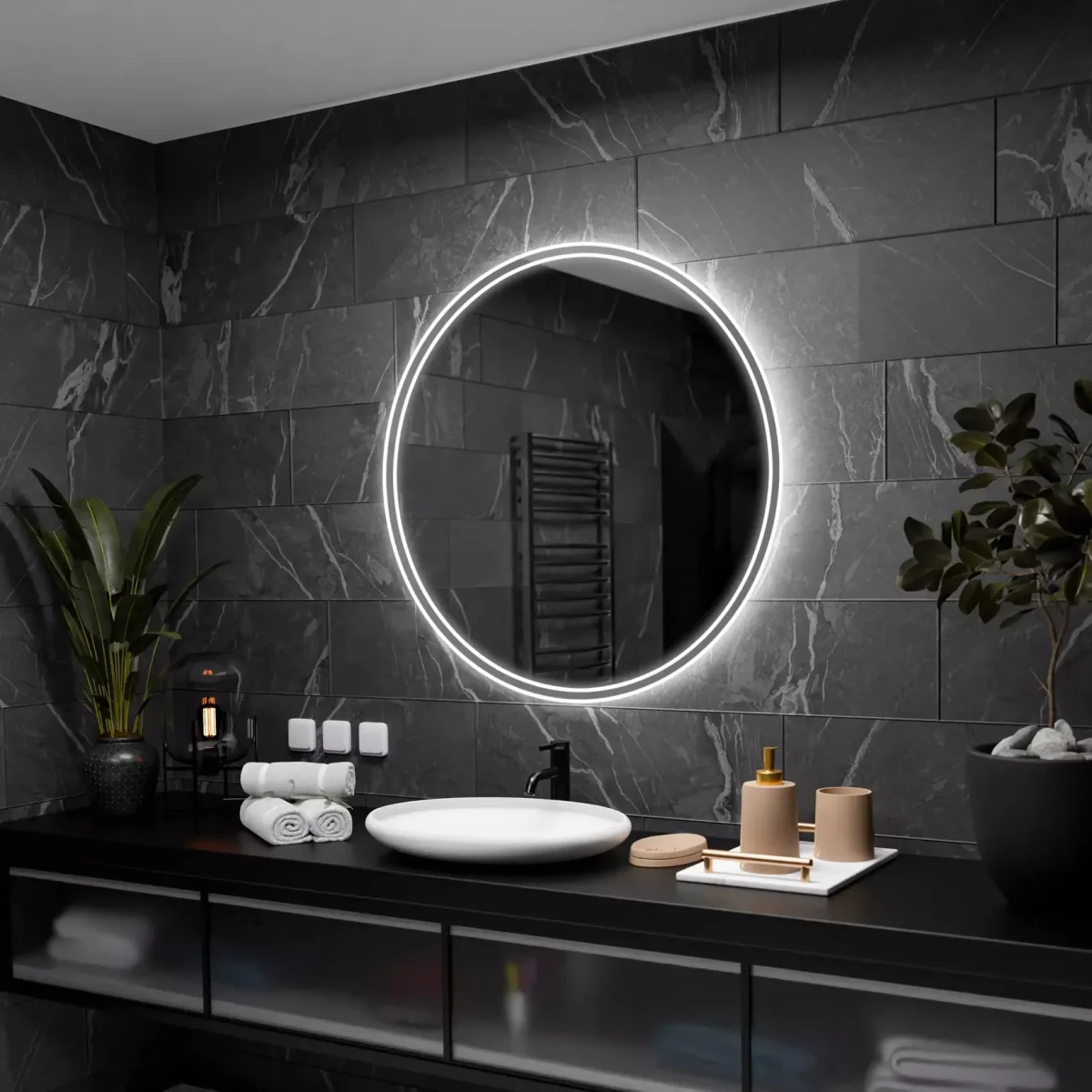 Le système d’éclairage de ce miroir rond repose sur une technologie Dual LED à double anneau, intégrant des bandeaux LED 2835 à 120 pièces par mètre fonctionnant en 12V. Trois températures de couleur sont disponibles en séquence tactile : blanc froid, blanc neutre et blanc chaud, sélectionnables par pression simple sur l’interrupteur tactile central. En maintenant ce même interrupteur, l’intensité lumineuse s’atténue ou s’intensifie en toute fluidité, sans à-coup. L’alimentation 230V est convertie par un transformateur 12V intégré, entièrement dissimulé derrière la vitre, pour un rendu visuel épuré sans câble apparent. Cette architecture garantit une sécurité optimale et une installation soignée dès le premier regard.