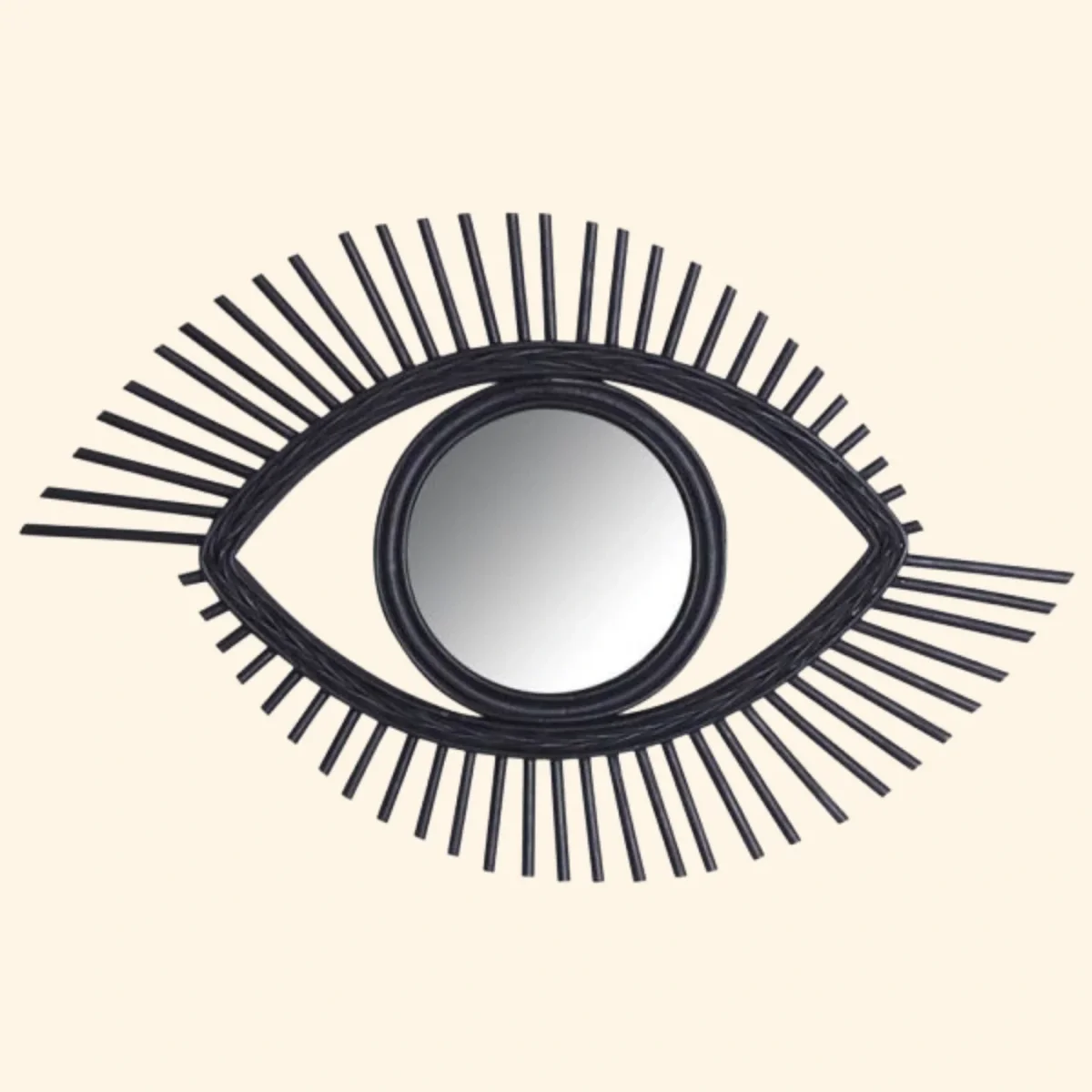 La forme d’œil de ce miroir mural n’est pas anodine. Elle évoque la protection, l’éveil et la clairvoyance, conférant une ambiance apaisante à votre intérieur. Son cadre en rotin naturel, laqué en noir profond, apporte un contraste subtil entre authenticité et modernité. Il s’intègre aussi bien dans un intérieur bohème que dans une décoration industrielle ou minimaliste.