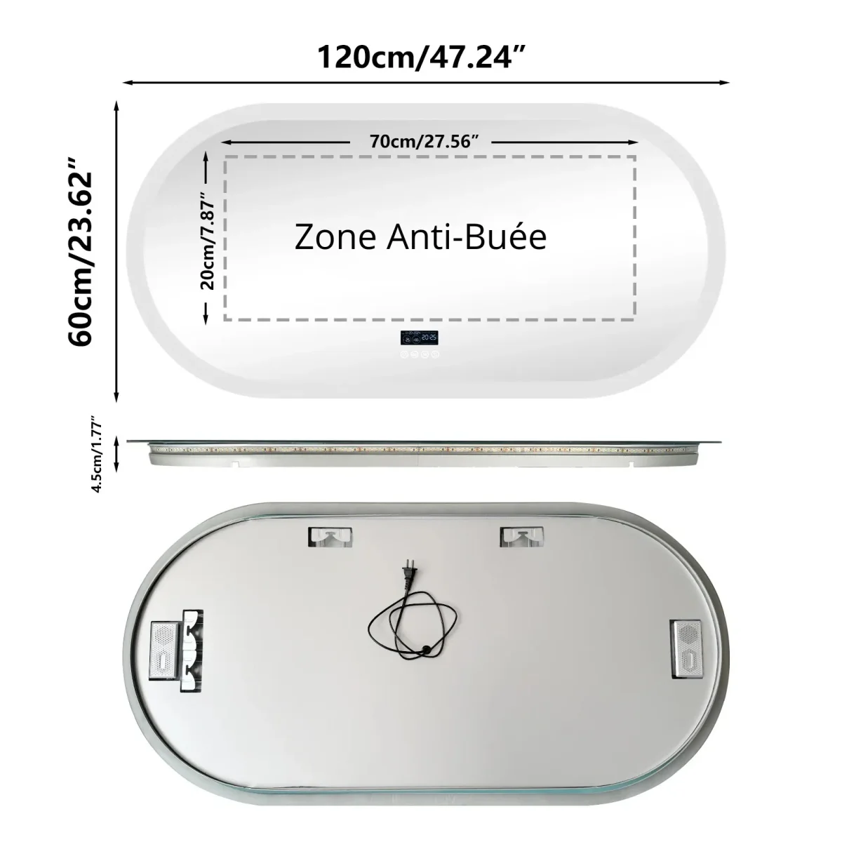 La forme ovale arrondie de ce miroir salle de bain Bluetooth est son atout esthétique majeur. Ses courbes adoucissent les angles souvent rectilignes d’une pièce d’eau et créent immédiatement une signature visuelle distinctive, à mi-chemin entre le miroir de salle de bain fonctionnel et l’objet décoratif. À 120 cm de largeur, il s’impose au-dessus d’un meuble vasque simple ou d’un plan de travail, dans une suite parentale, une salle de bain d’hôtel ou un dressing. Son épaisseur de 4,5 cm intègre discrètement l’ensemble de l’électronique. La fixation murale est assurée par 2 crochets solides avec visserie incluse, et le miroir peut être alimenté par prise standard ou câblage direct pour interrupteur mural.