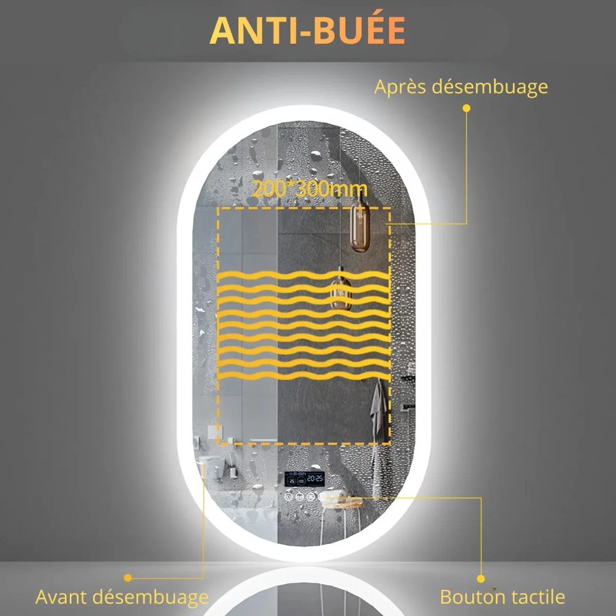 C’est le différenciant le plus visible de ce miroir : un écran numérique intégré affiche en temps réel l’heure, la date, la température ambiante et le niveau de luminosité actif. Pendant que vous vous maquillez ou vous rasez, l’information est là, directement sur le miroir, sans avoir à chercher votre téléphone ou regarder une montre. Les 4 boutons tactiles indépendants permettent de contrôler séparément l’éclairage, la température de couleur, l’anti-buée et le Bluetooth — chaque fonction est accessible en une seule pression, les mains mouillées comme sèches. La fonction mémoire retient automatiquement vos derniers réglages à chaque allumage, sans manipulation répétitive.