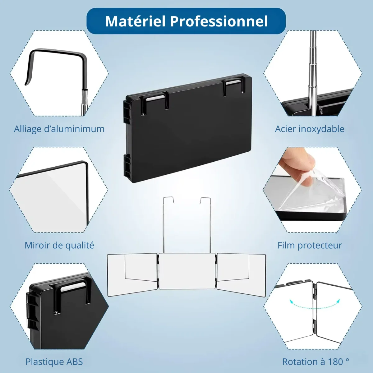 La conception triptyque de ce miroir repose sur deux panneaux latéraux articulés sur le panneau central, chacun pivotant jusqu’à 180°. Cette amplitude de rotation permet d’ajuster l’angle de réflexion avec précision selon la zone à observer — profil droit, profil gauche, nuque, ou même une combinaison des trois. Le verre miroir haute définition de chaque panneau restitue une image nette et sans distorsion, bien supérieure aux surfaces plastique réfléchissant bon marché. Le tout est protégé par un film protecteur inclus pour préserver la surface jusqu’à la première utilisation. Les bords sont lisses, sans arête vive, pour une manipulation sans risque.