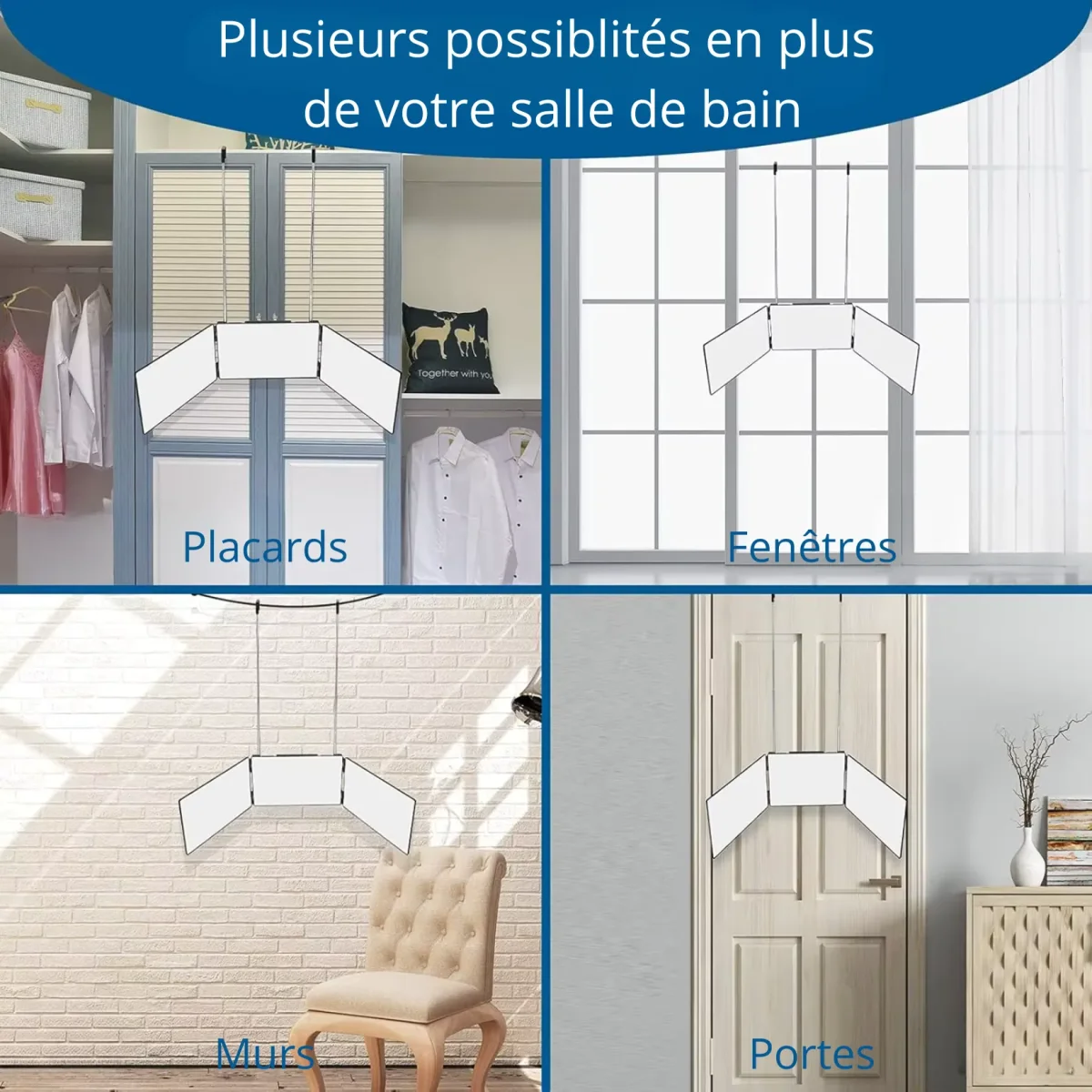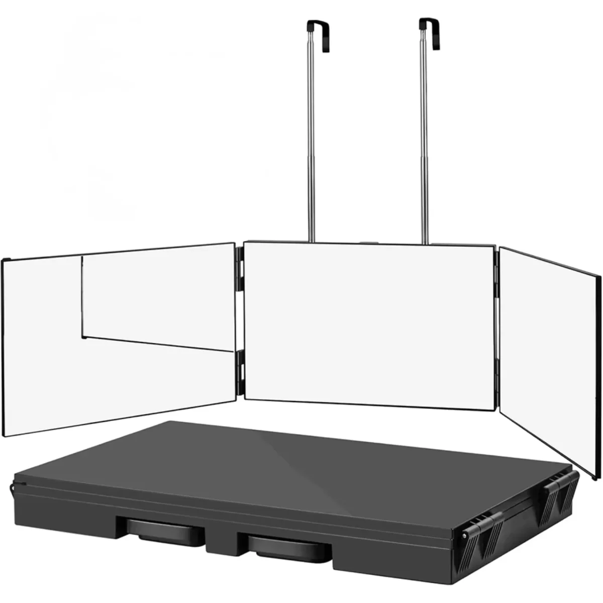 Ce miroir triptyque salle de bain se suspend sans perçage grâce à deux tiges télescopiques en acier inoxydable réglables de 0 à 44 cm. Le crochet en alliage d’aluminium s’adapte à n’importe quel support horizontal — barre de porte, tringle de fenêtre, étagère ouverte, tringle de placard. Quatre configurations de pose sont disponibles : porte, mur, fenêtre ou placard. La hauteur de suspension s’ajuste avec précision pour positionner le miroir exactement au niveau du visage ou de la zone à travailler. Une fois replié, l’ensemble mesure seulement 27,5 x 17 x 2,7 cm — il se range dans un tiroir, se glisse dans un sac de voyage ou s’emporte facilement en déplacement.